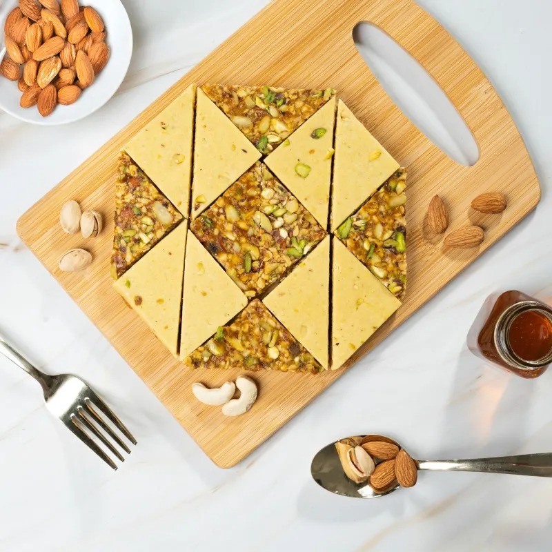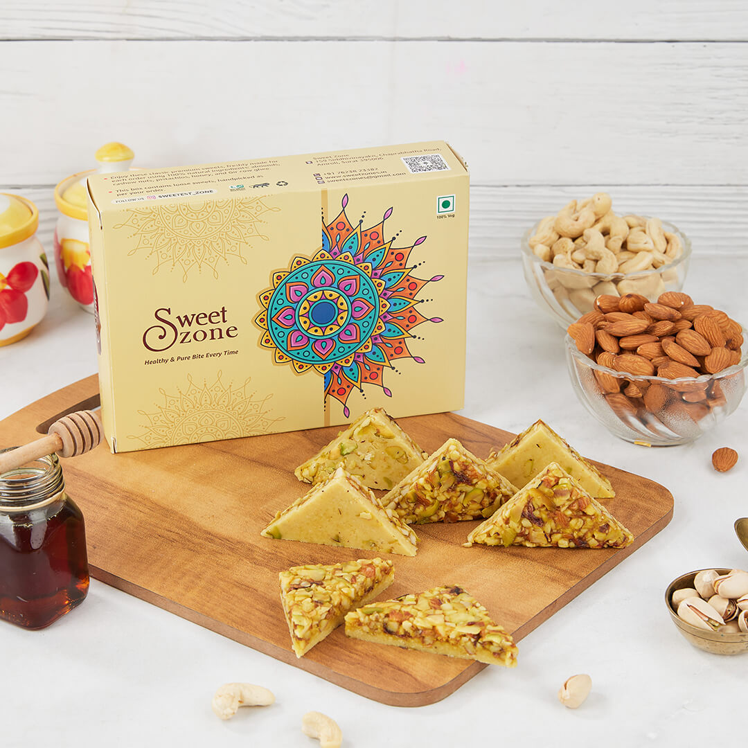 We use handpicked almonds, cashews, pistachios, Kimia red dates, honey, and pure cow ghee, layered with a kaju katri base for the Almond Pizza. Each ingredient is carefully chosen for taste, freshness, and nutrition.