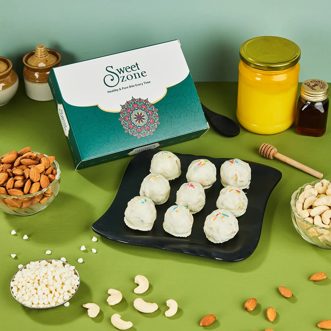 To give it a modern twist, every ball is coated in smooth, creamy white chocolate, making it both luxurious and irresistible. Lightly bound with pure cow ghee and just a touch of honey, these treats are wholesome yet guilt-free, without being overly sweet.